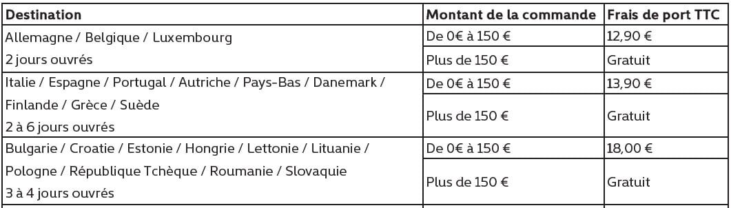 Pour toute commande inférieure à 100€, les frais de livraison s’élèvent à 10€ TTC.